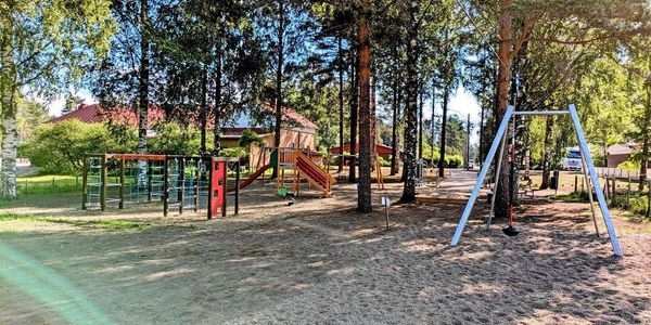 Ravintolan naapurissa puisto jossa keinut, liukumäki, kiipeilytelineet ja vaijeriliuku.