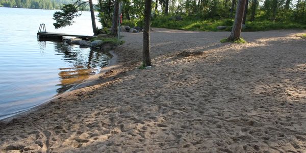 Hyvä hiekkaranta, laituri, pukukopit